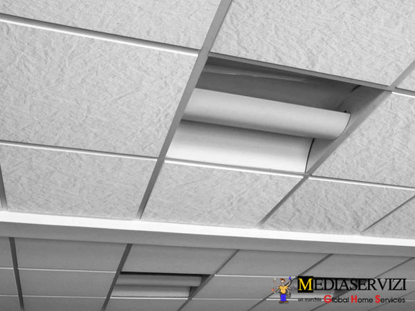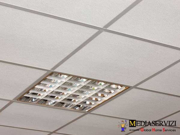 Il controsoffitto a pannelli in fibra è molto diffuso negli edifici pubblici e commerciali (uffici, negozi, scuole…) grazie ai vantaggi che questo tipo di controsoffittatura presenta: