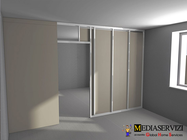 - Resa estetica: realizzando una parete o tramezzo in cartongesso potrai ridefinire gli ambienti della tua abitazione, attraverso a nuovi elementi divisori e rendendo più funzionale la divisione degli spazi. È possibile inserire nella parete sia la porta a battente che la porta a scomparsa o scorrevole esterna. Il cartongesso inoltre si integra perfettamente con la muratura circostante e gli altri elementi architettonici, per una resa estetica assicurata.