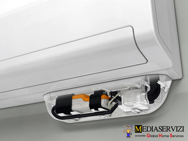 Può essere installata sia sulla unità interna che su quella esterna, si collega alla alimentazione del climatizzatore, consuma pochissimo (12 V) e si attiva solo quando il climatizzatore produce condensa.